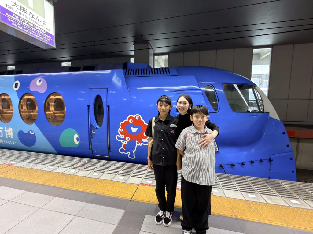 帰りはラピートでゆったり。この日は偶然にも出会えたミャクミャクのラピートと記念撮影!