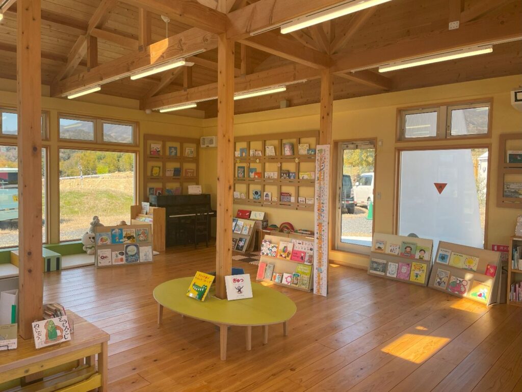 棚いっぱいの絵本に囲まれながら、親子でゆったり過ごせる場所です。